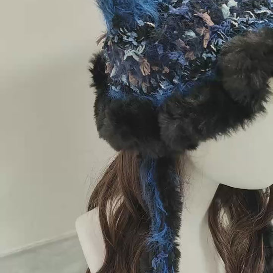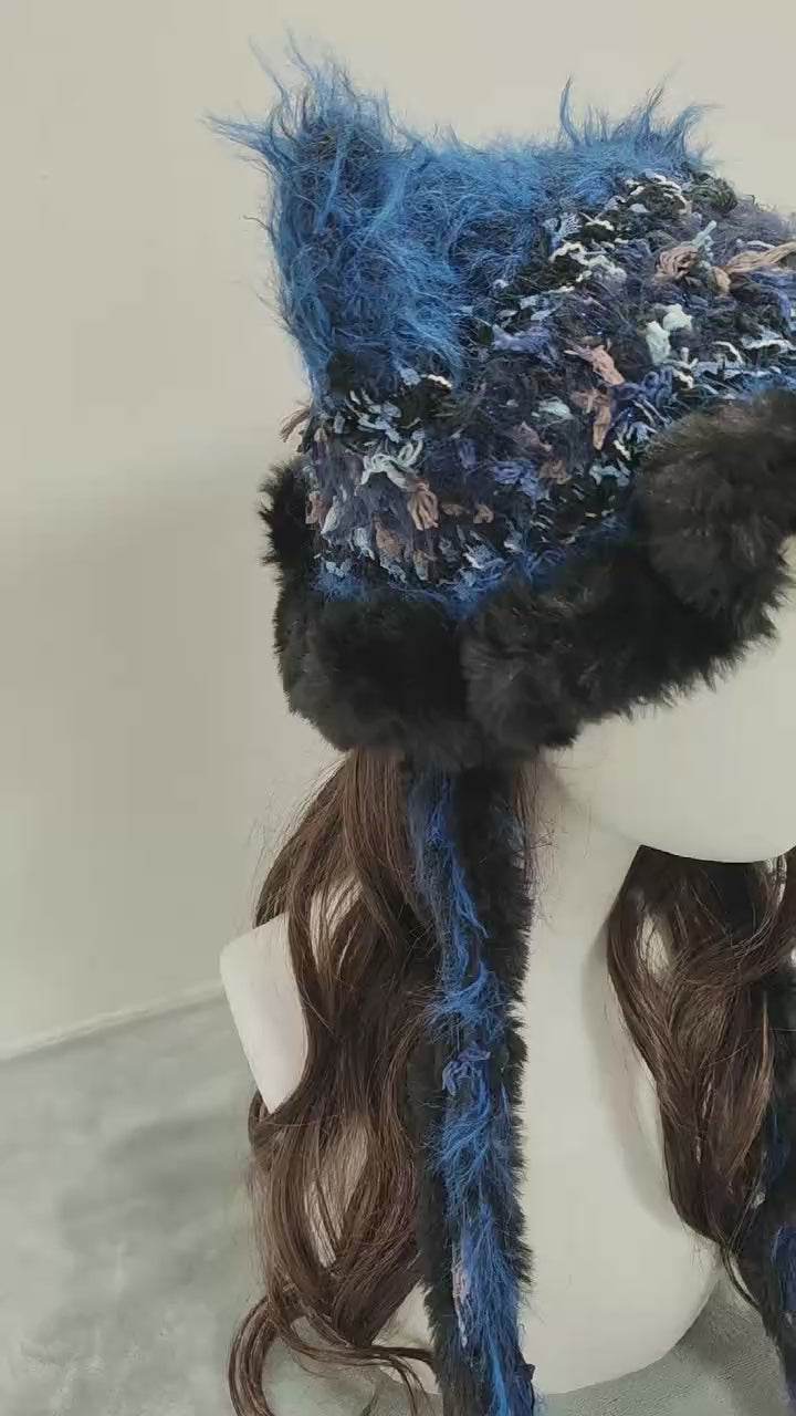 Handmade from fluffy mixed yarn, this bold statement piece blends deep black with electric blue — inspired by dancing flames in the dark. The black ruffle edge adds a gothic touch, while the cat ear silhouette keeps it playful and unique.
