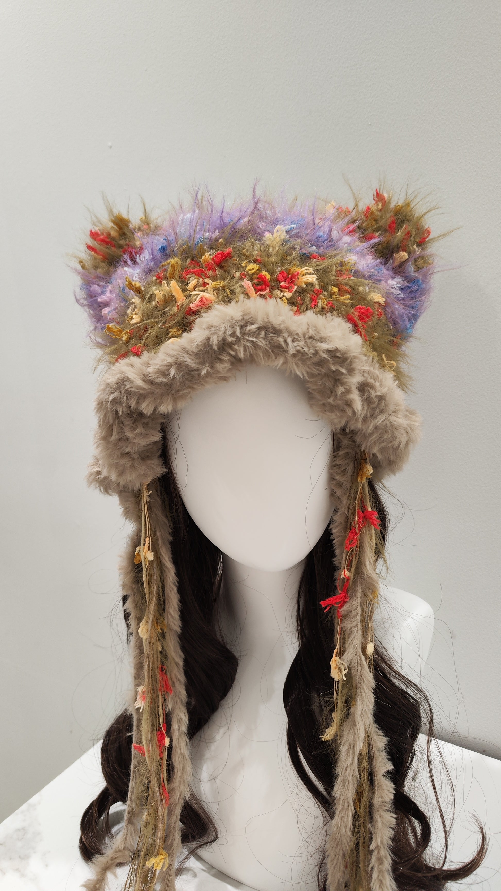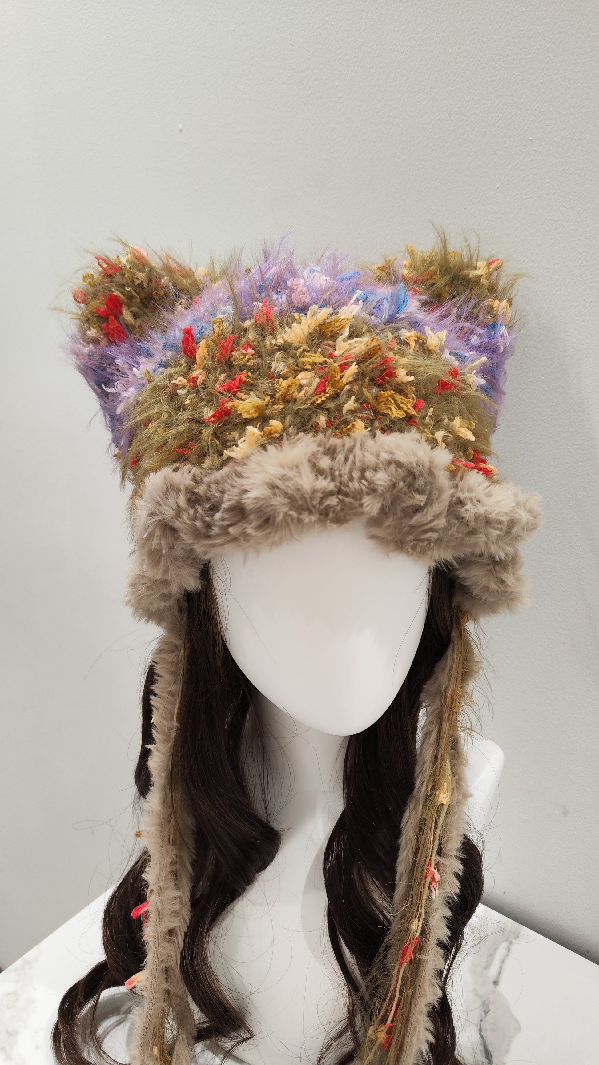 Handcrafted with soft light purple and natural brown mixed yarns, this hat creates a textured, painterly effect reminiscent of autumn fields and cozy evenings. The ruffled jellyfish edge adds flowing volume, while the cat ear silhouette brings a playful, whimsical touch.