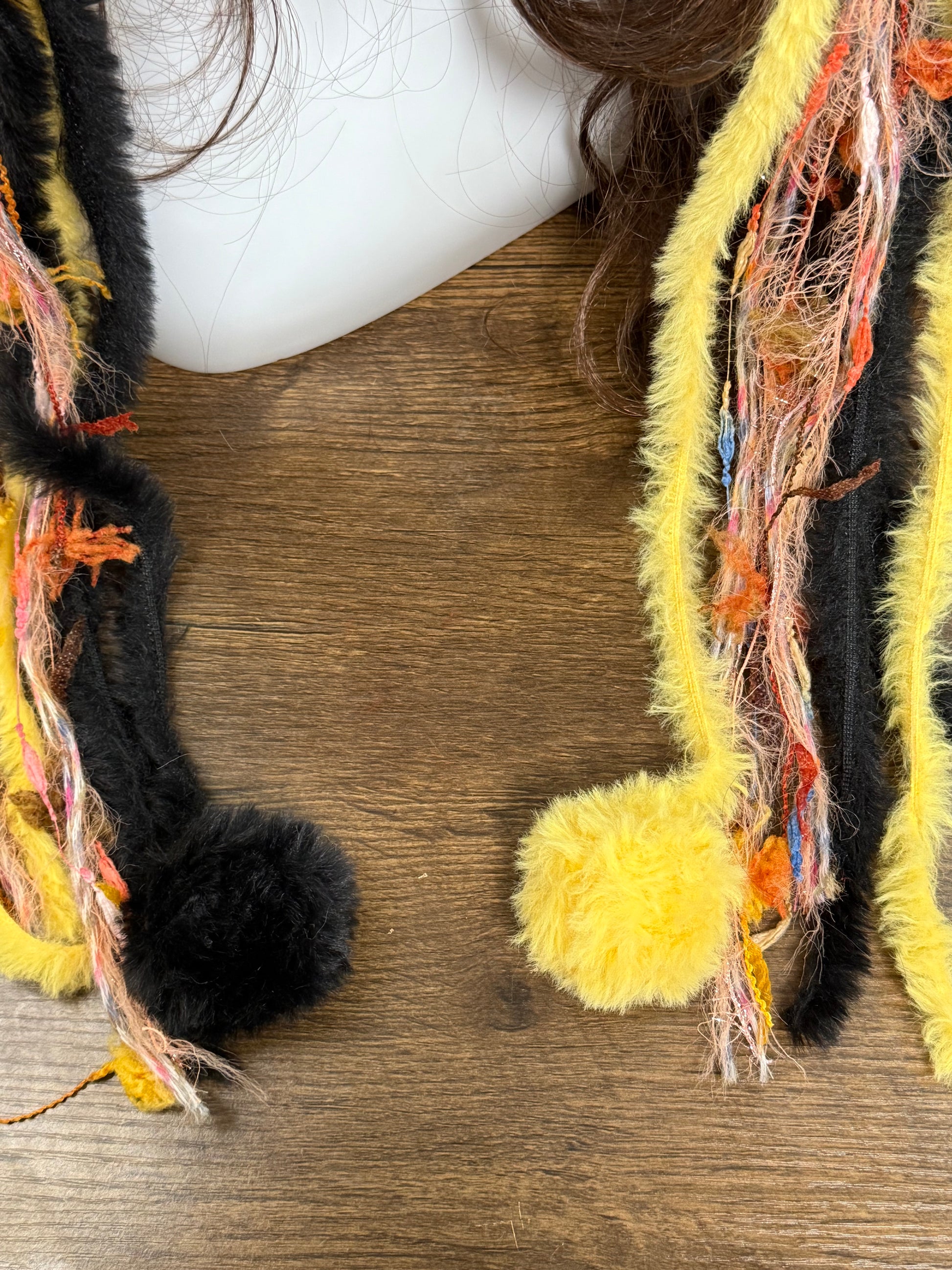 Yellow Black Cat Ear Jellyfish Hat with Pom Poms – Handmade Fluffy Crochet Beanie