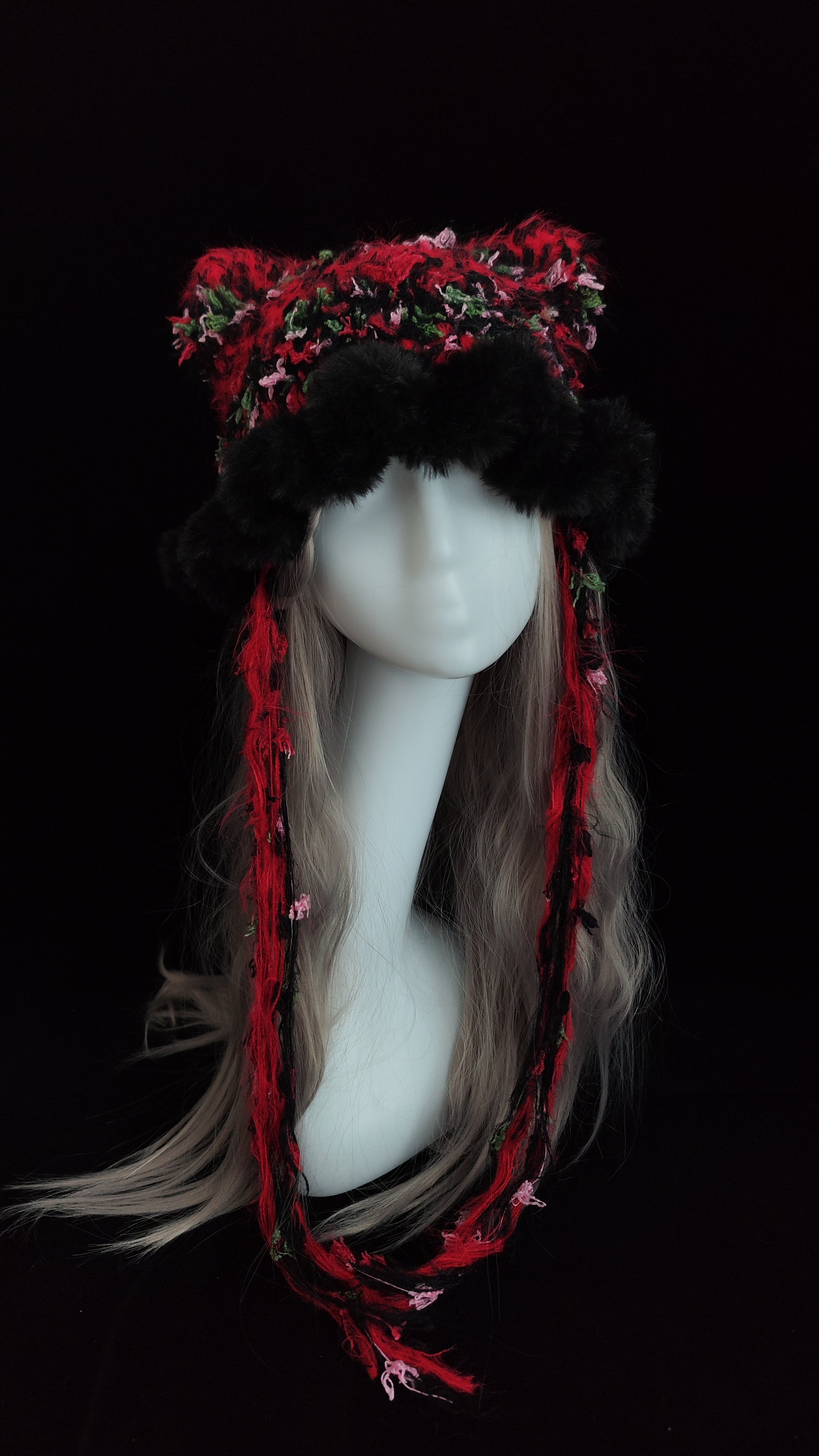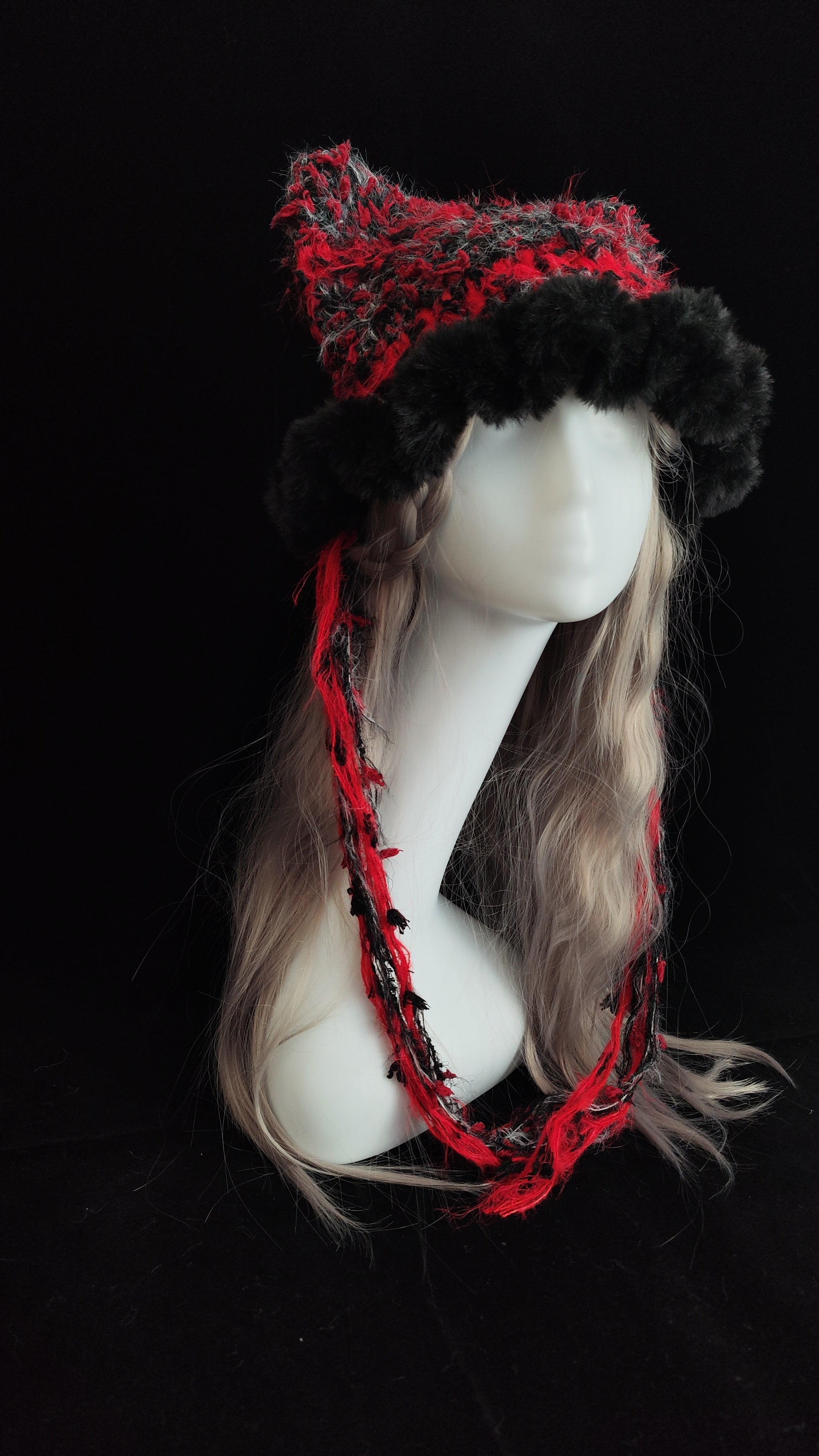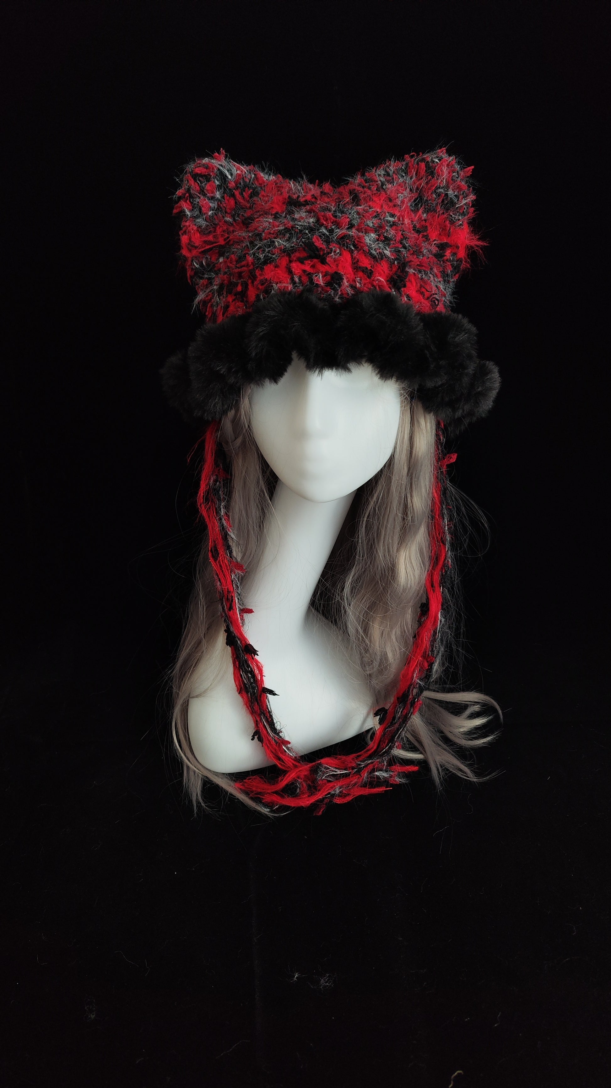 Red Black Gothic Cat Ear Jellyfish Hat – Handmade Mixed Yarn Crochet Beanie