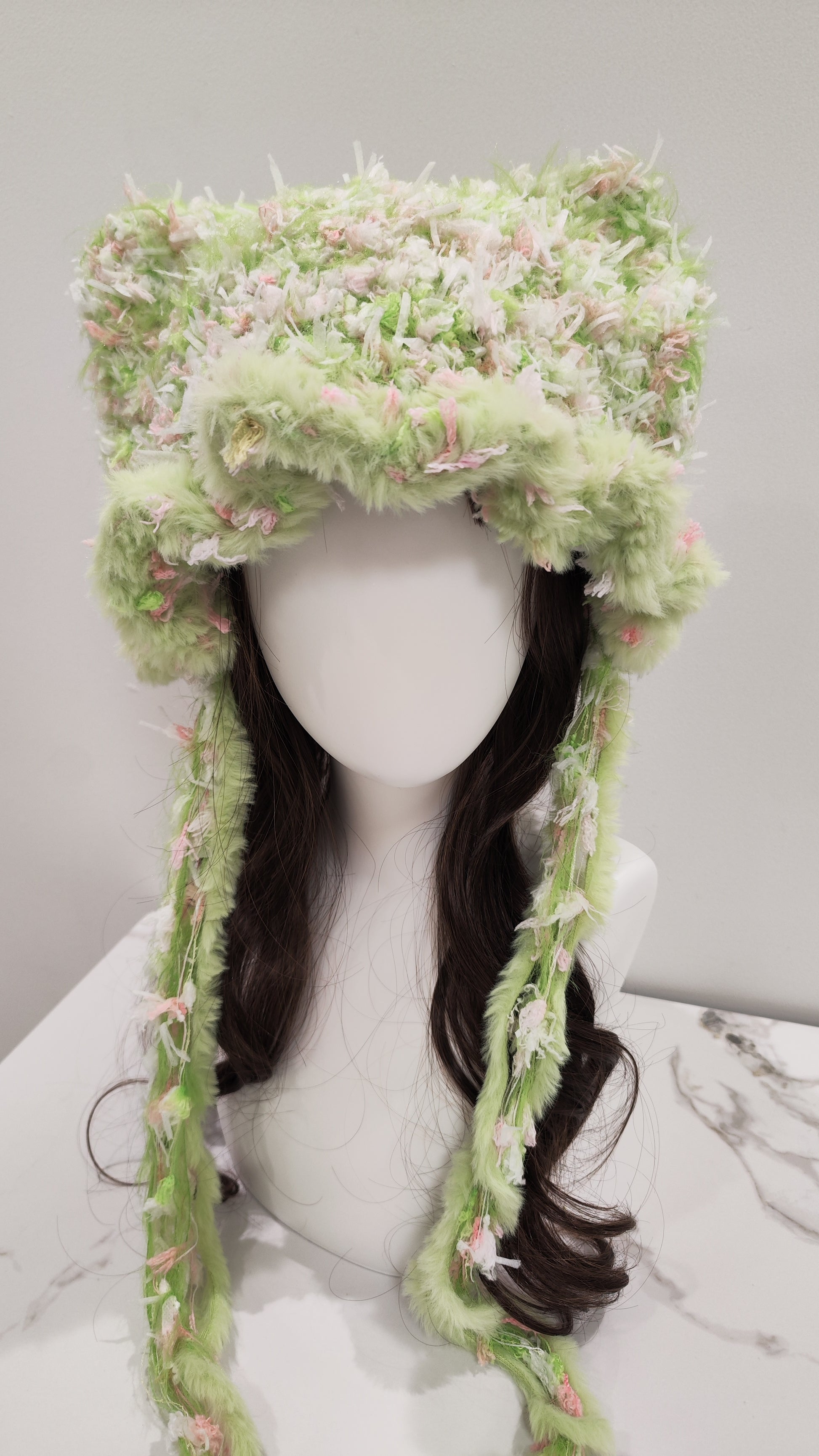 Made with soft mixed yarns in gentle green and pastel tones, this hat features a ruffled jellyfish edge that flows gracefully and a playful cat ear silhouette that adds whimsical charm.